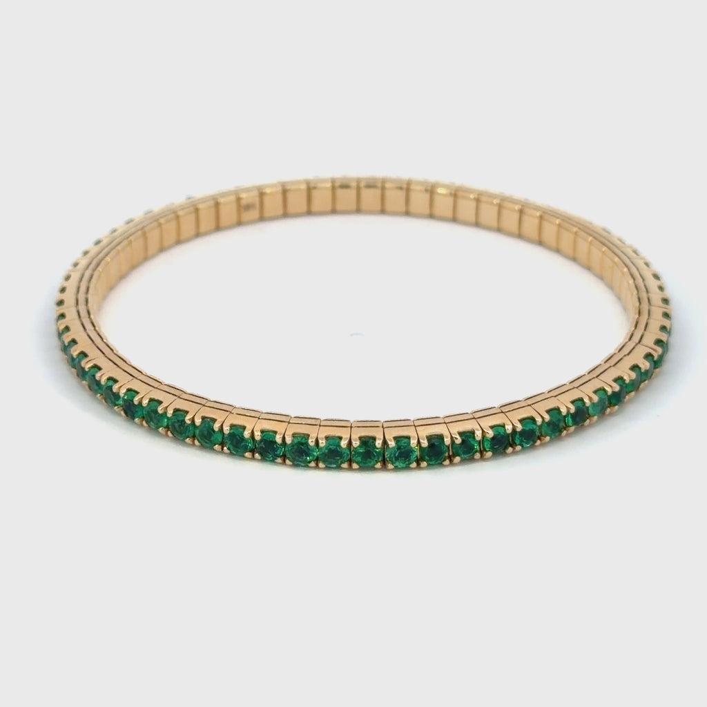 Perfect for stacking or wearing alone, this 14K yellow gold green emerald stretch tennis bracelet adds a bold pop of color to any jewelry collection. Its timeless design and vibrant gemstones make it suitable for both everyday wear and special occasions.