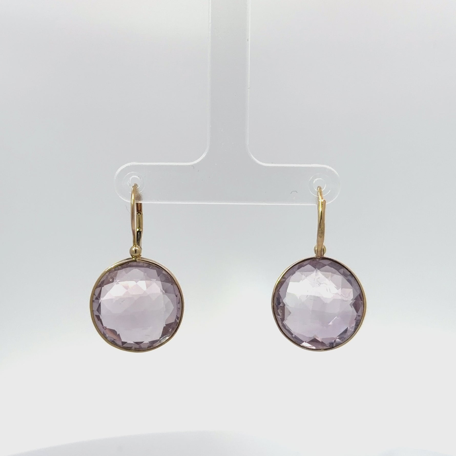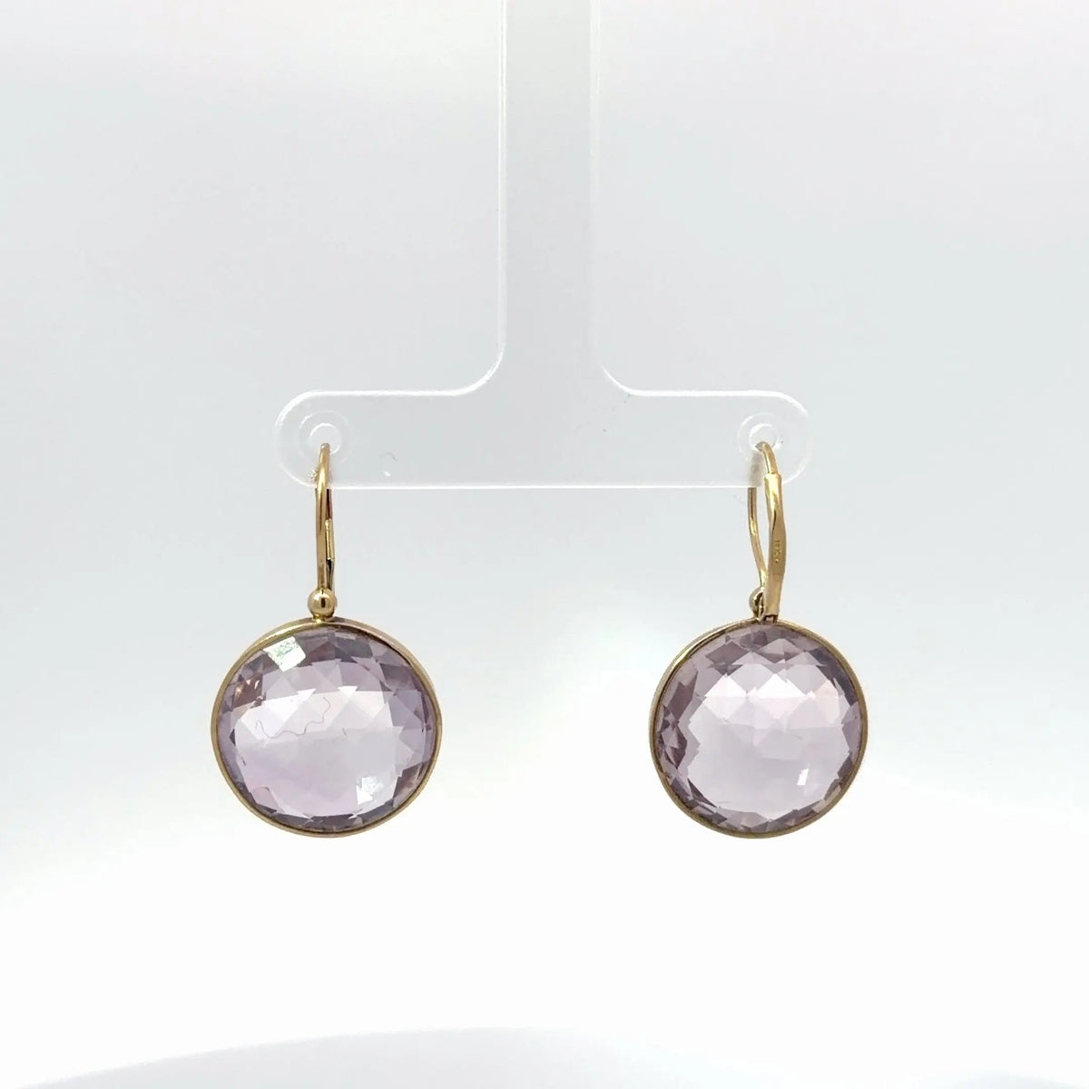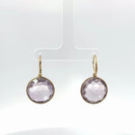 These 14k yellow gold purple gemstone dangle earrings showcase a timeless round silhouette in a refined bezel setting. The softly faceted purple stones catch the light beautifully, creating a delicate glow that enhances their subtle lavender tone.