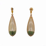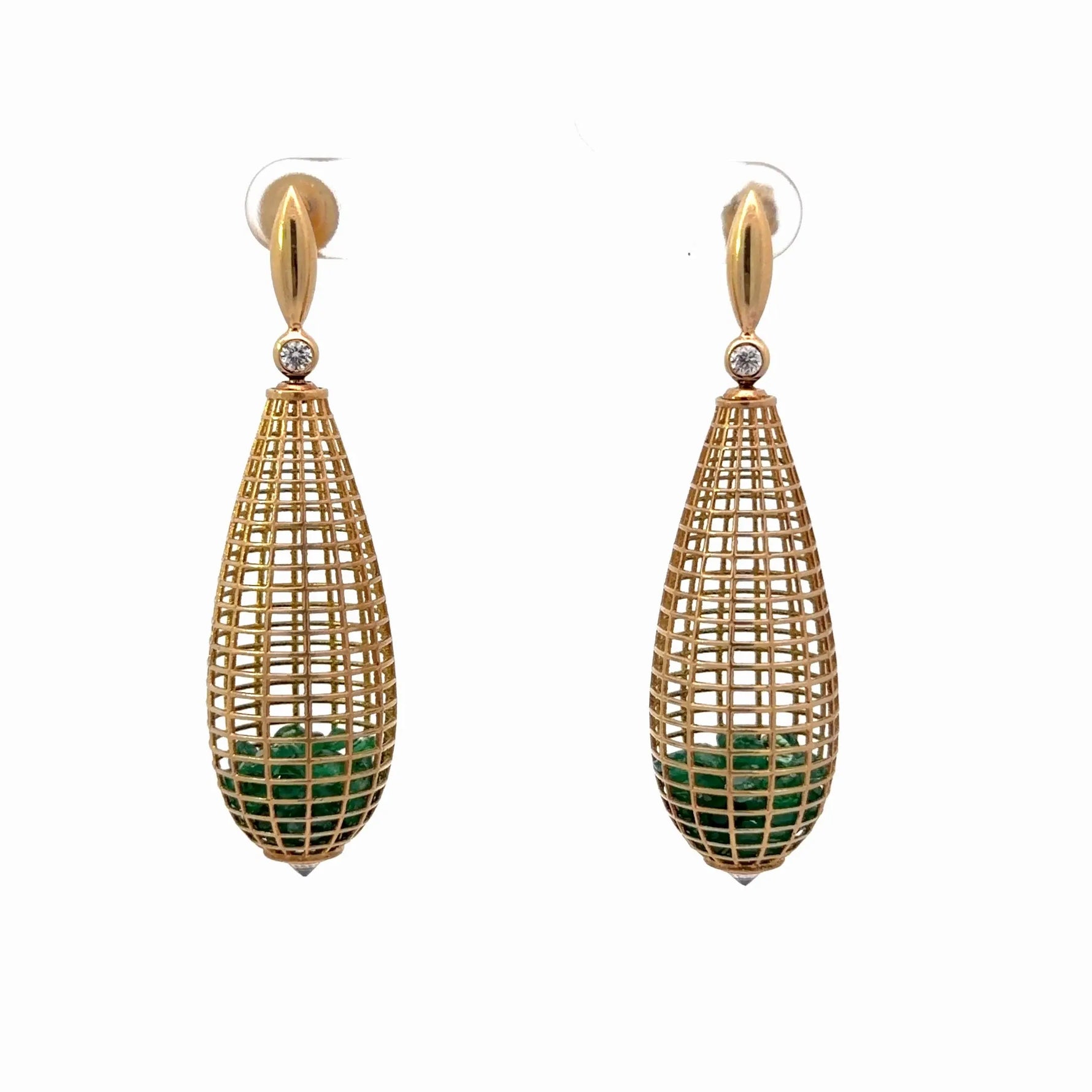 These 18k yellow gold emerald sapphire teardrop dangle earrings showcase a striking open lattice silhouette filled with rich green emeralds. The sculptural cage-like design creates dimension while allowing light to pass through, enhancing the vivid color of the gemstones within.