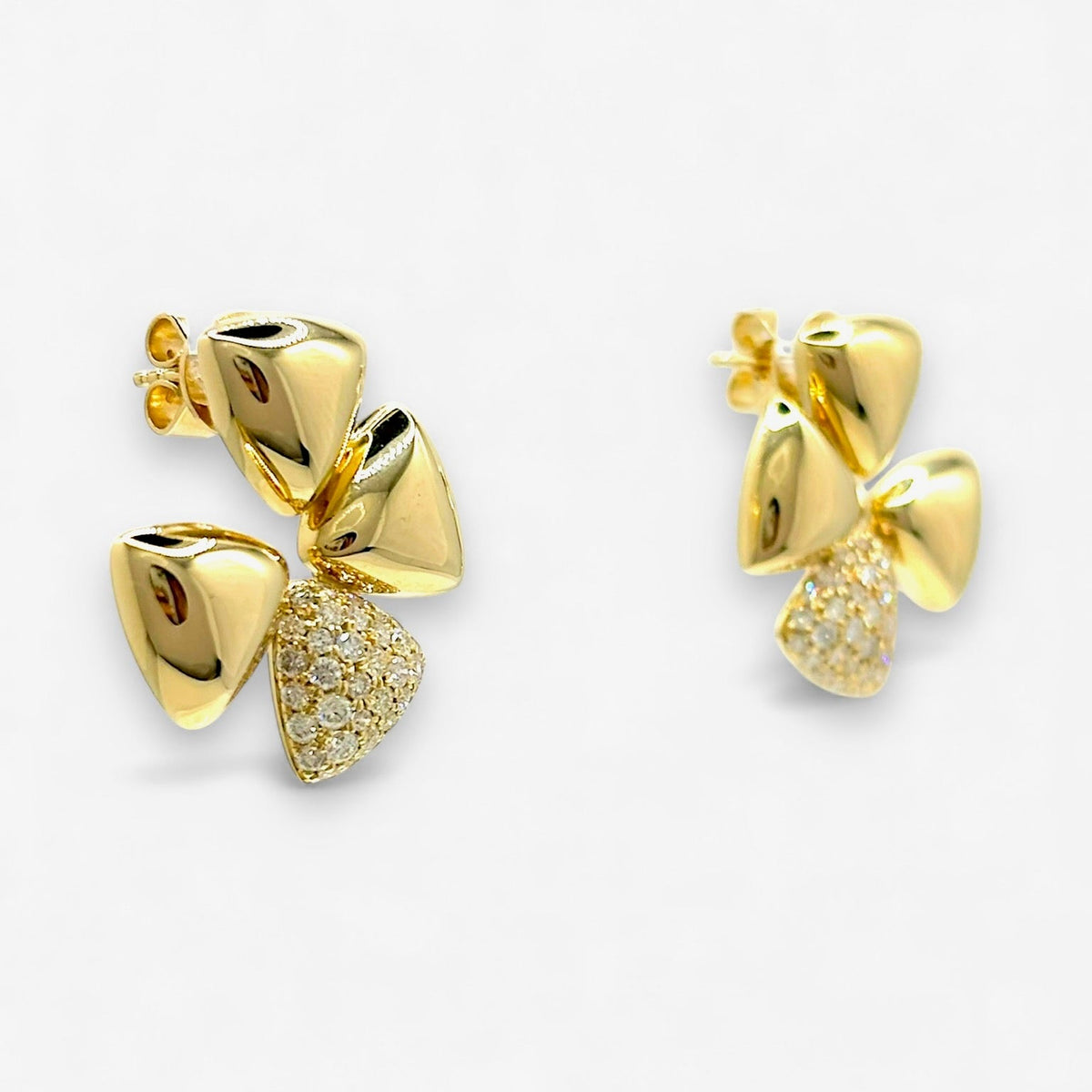 These 14K Yellow Gold Flower Pave Earrings bring a fresh, sculptural approach to classic floral jewelry. Each earring features smooth, dimensional gold petals arranged in a modern bloom, with one petal fully pavé-set in natural diamonds for added sparkle. With a total of 1.16 CTW, the diamonds create a radiant focal point without overwhelming the design.