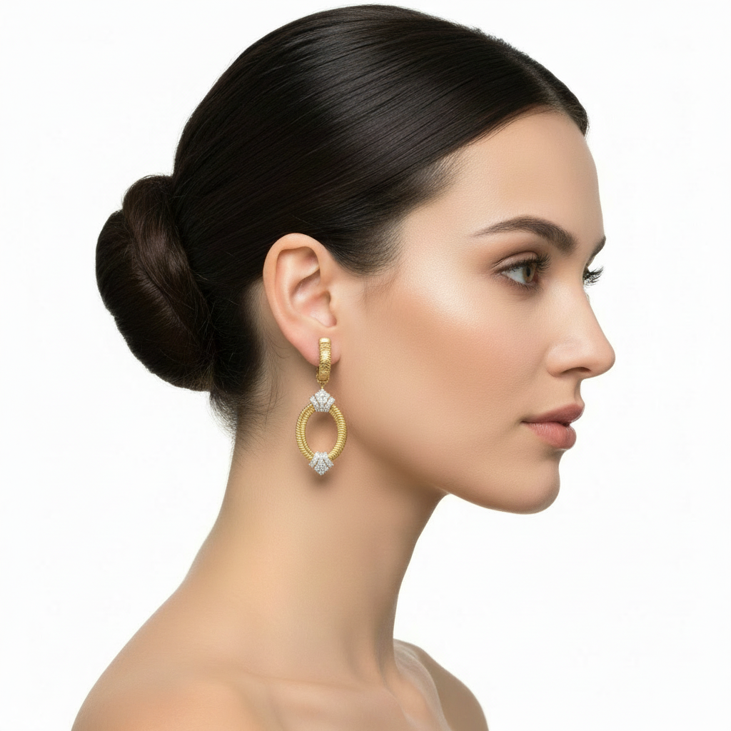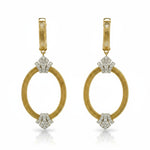 Unit price perThese 14K Yellow Gold Textured Open Oval Diamond Drop Earrings bring a graceful blend of shine, texture, and easy elegance. The open oval shape adds soft movement, while the detailed gold patterning gives the earrings a warm, dimensional look. Pavé-set diamond stations highlight the top, sides, and bottom of each oval, adding sparkle that feels refined and timeless.