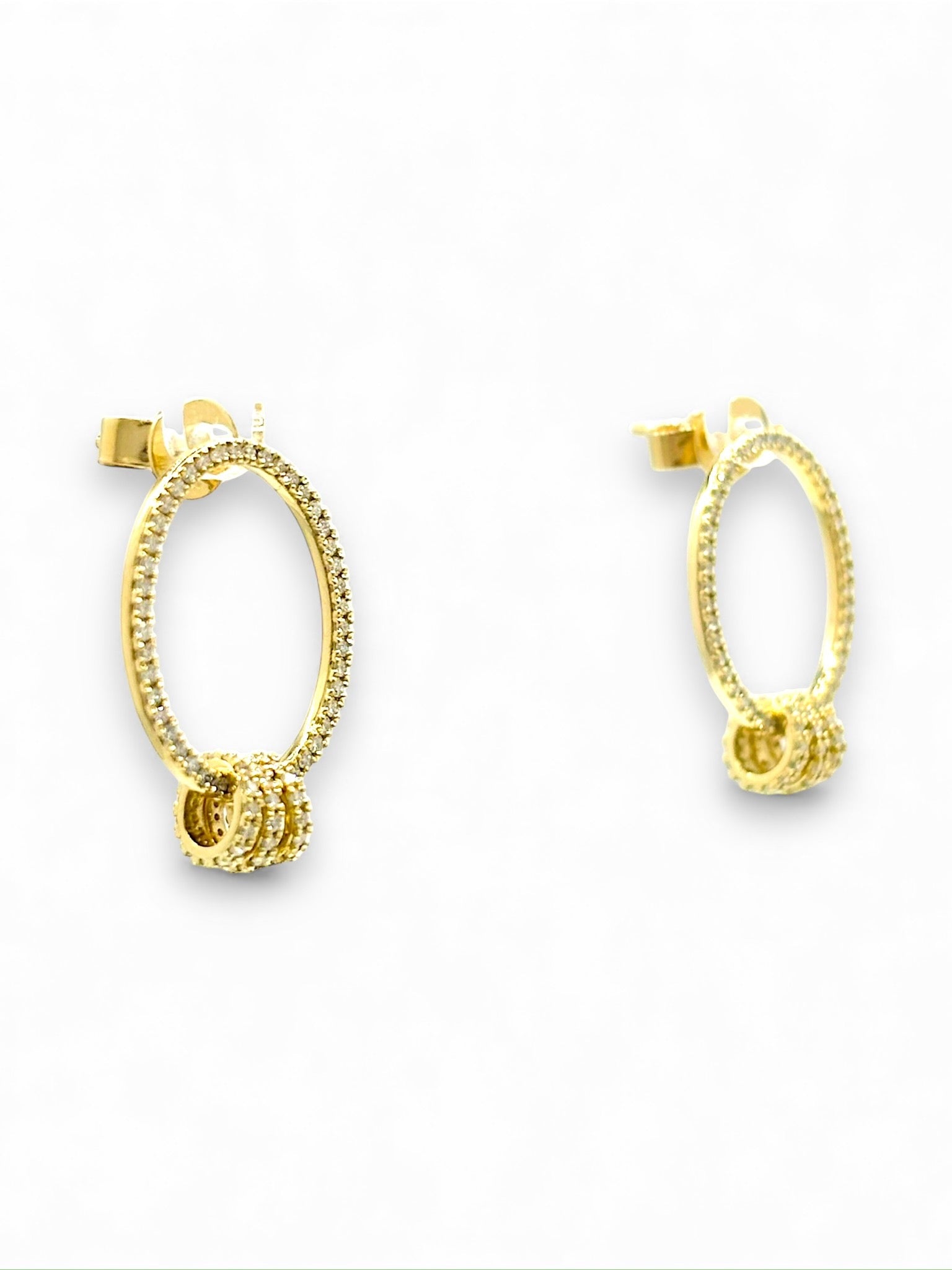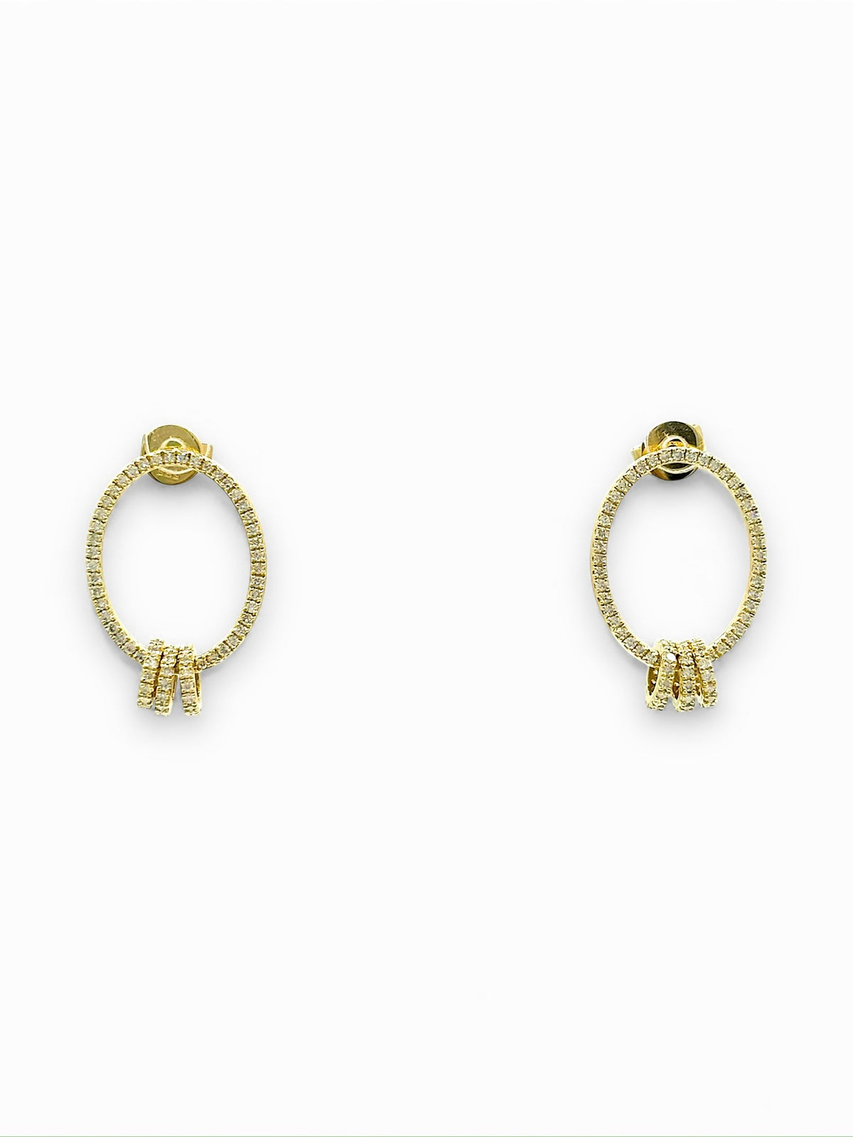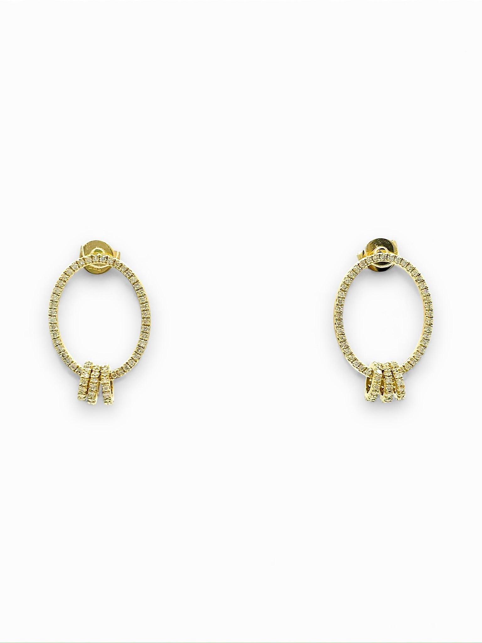 Unit price perThese 14K Yellow Gold Oval Diamond Earrings offer a refined mix of sparkle and movement. Each polished oval is lined with natural diamonds and finished with three diamond-accented rings that slide gently along the base, adding subtle motion and texture. The result is a clean, modern silhouette with a touch of playful elegance.