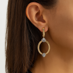 Unit price perThese 14K Yellow Gold Textured Open Oval Diamond Drop Earrings bring a graceful blend of shine, texture, and easy elegance. The open oval shape adds soft movement, while the detailed gold patterning gives the earrings a warm, dimensional look. Pavé-set diamond stations highlight the top, sides, and bottom of each oval, adding sparkle that feels refined and timeless.