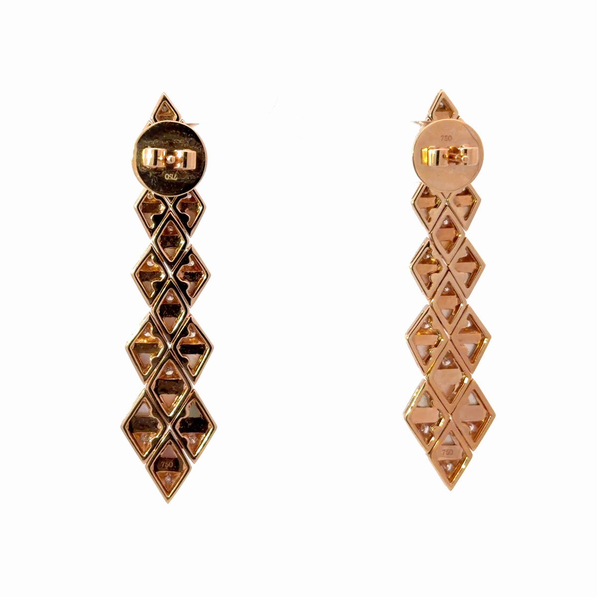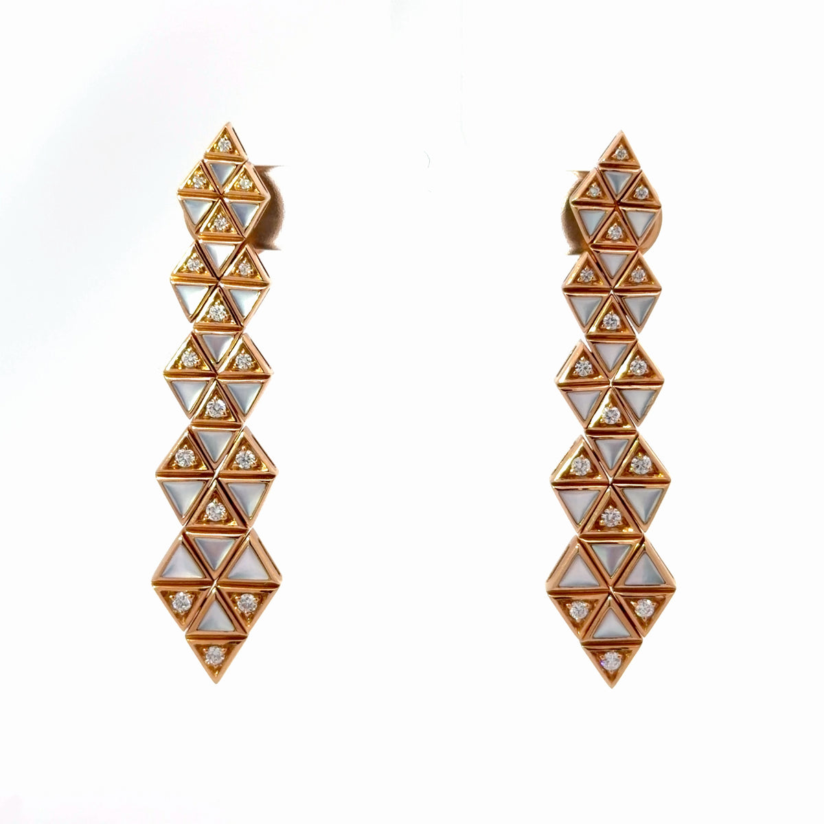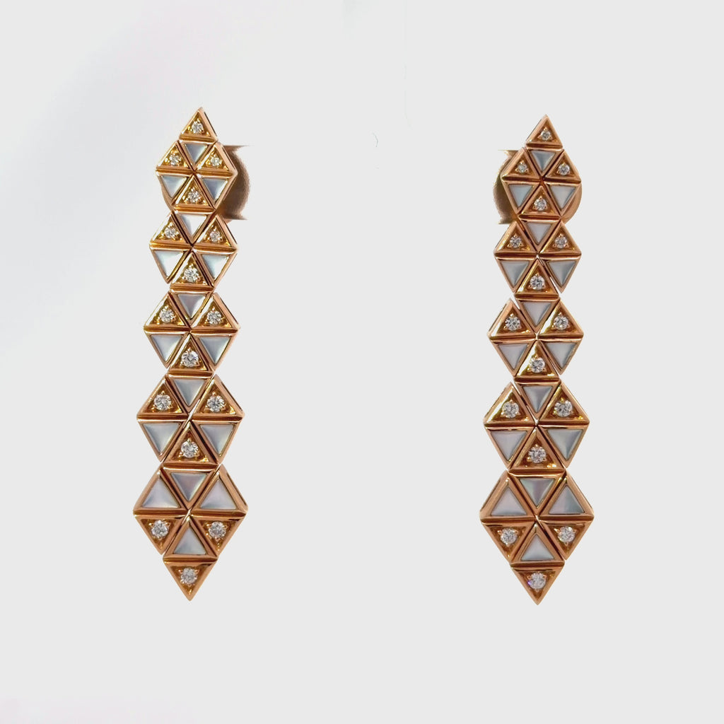 Unit price perThese Moonstone Diamond Triangular Drop Earrings by Sofragem showcase refined craftsmanship through a striking geometric design. Crafted in warm 18K rose gold, each earring features a cascading arrangement of triangular moonstone inlays accented with sparkling diamonds totaling 0.51 carats.