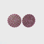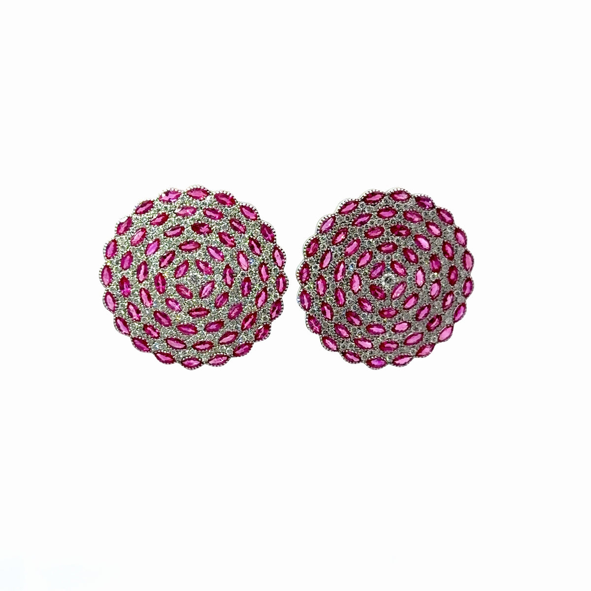 Unit price perThese Ruby And Diamond Earrings are crafted in luminous 18K white gold and feature a richly textured dome design set with vibrant rubies totaling 10.94 carats. Rows of round brilliant diamonds totaling 3.71 carats add dimension and brilliance, creating a luxurious pavé surface that catches the light from every angle.