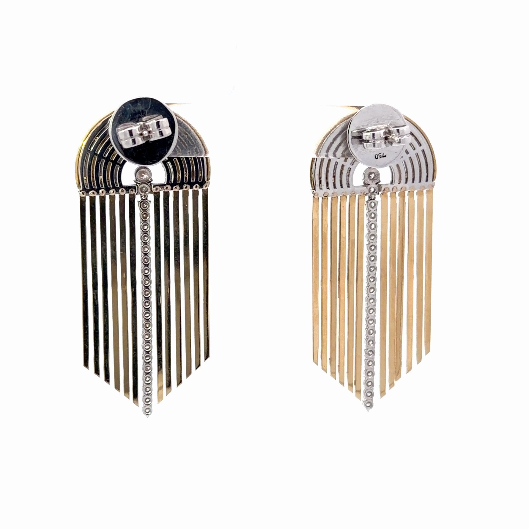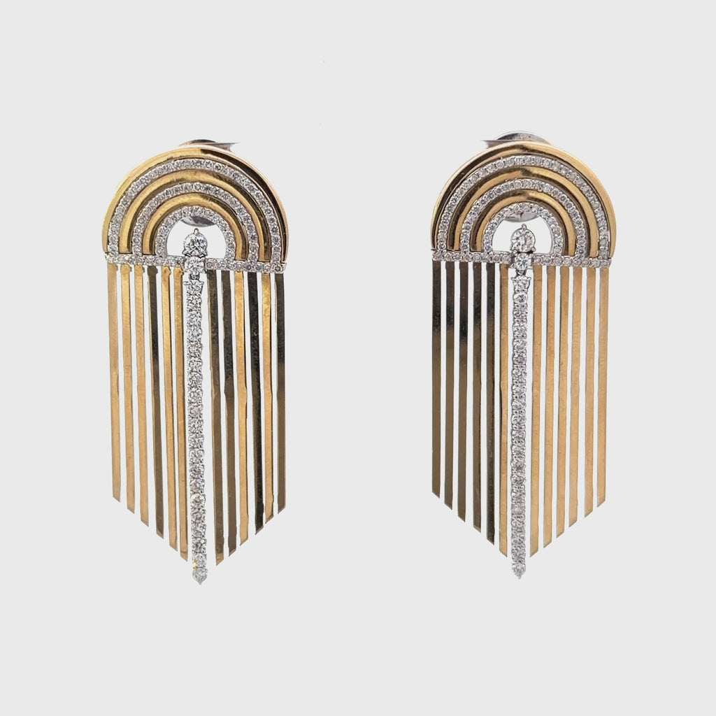 Unit price perThese Diamond Samba Drop Earrings by Jay Feder offer a striking balance of movement, symmetry, and fine craftsmanship. Designed in 18K yellow and white gold, each earring features layered arcs above elongated gold drops, creating a bold yet fluid silhouette.