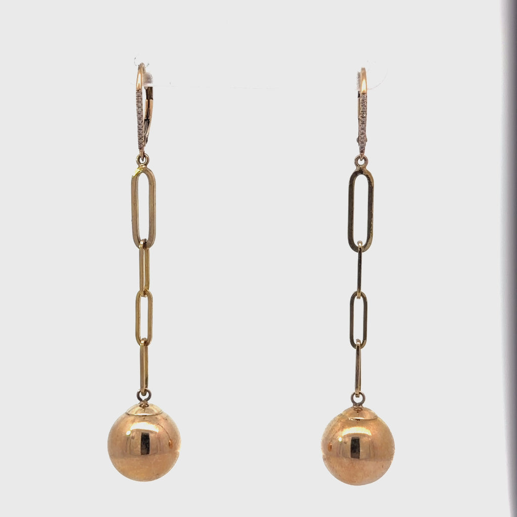 These 14k yellow gold hanging ball earrings feature a refined linear design accented by polished gold spheres. The elongated links create a contemporary silhouette that adds graceful length and fluidity to the overall look.