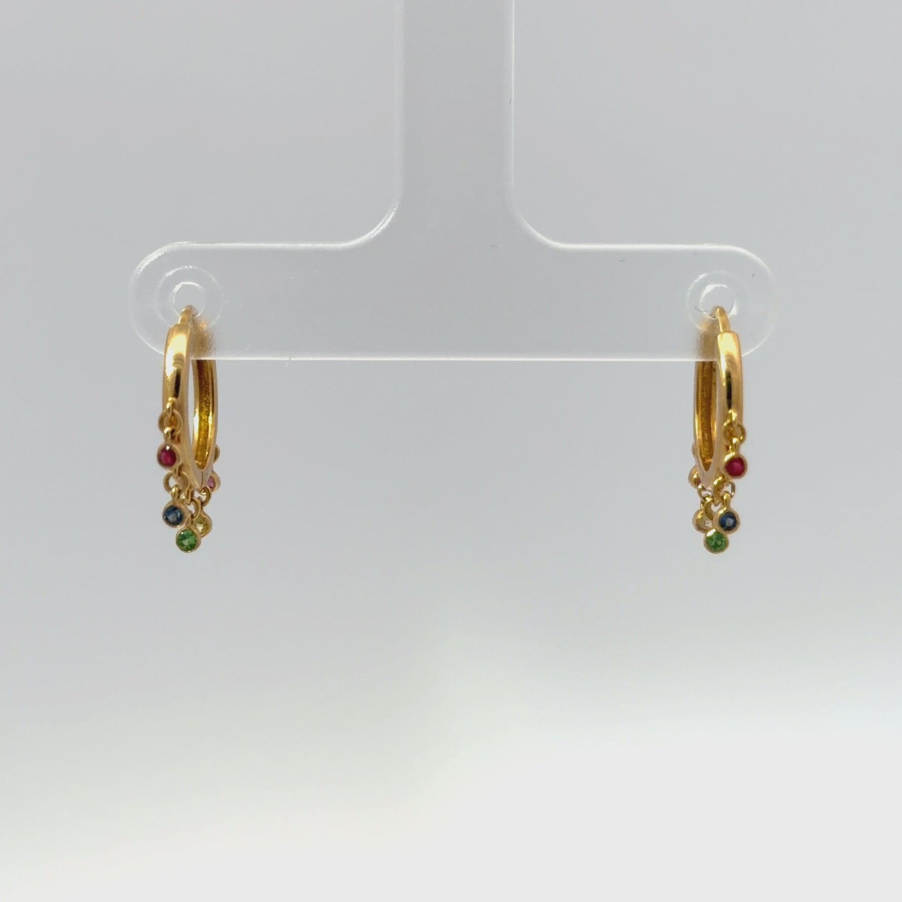 The polished yellow gold hoops provide a warm contrast to the vivid gemstone accents. Their petite scale keeps the design refined and easy to wear, making them a versatile addition to both casual and dressy looks.
