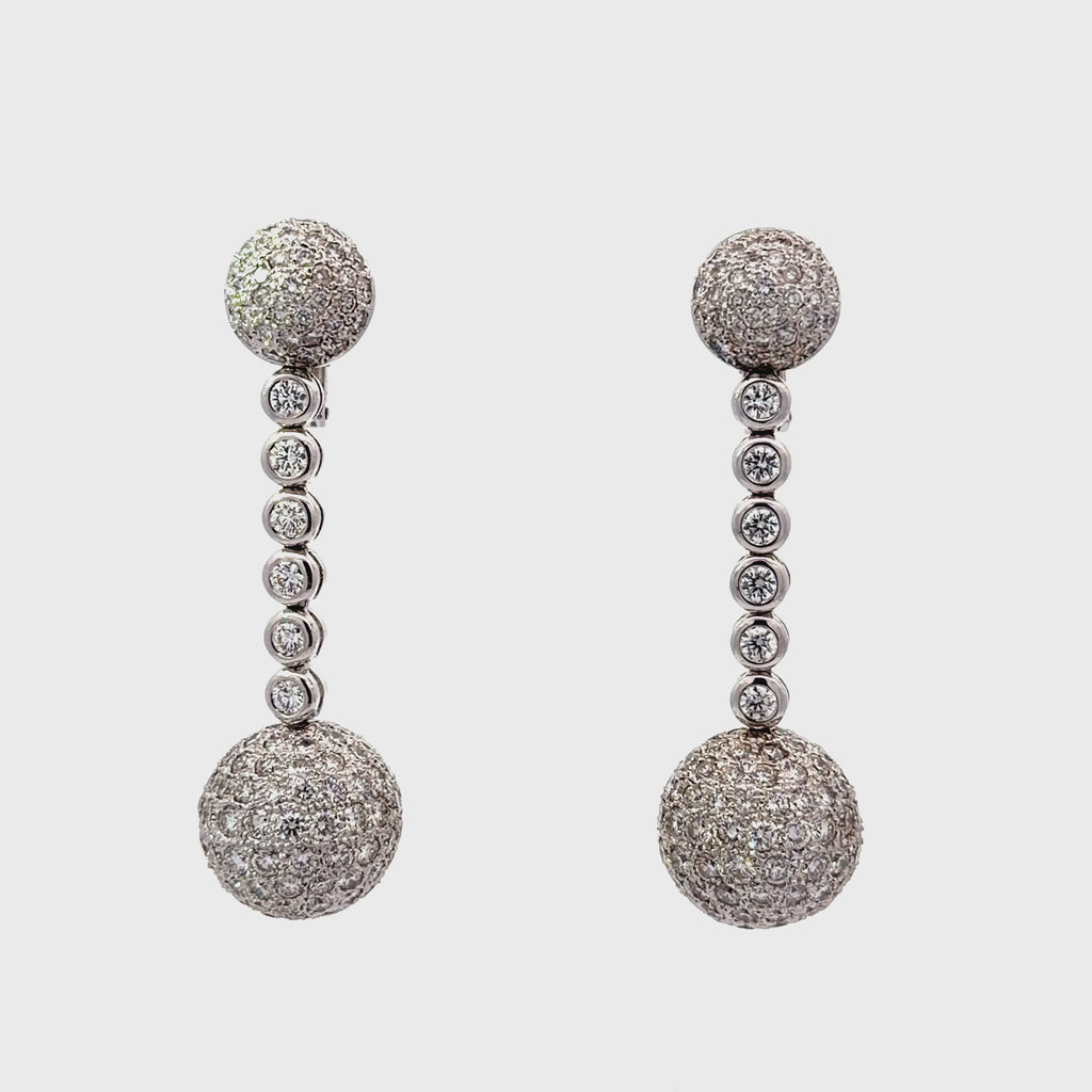 They feature a pavé ball drop dangle design with diamond-set spheres connected by a vertical diamond link.