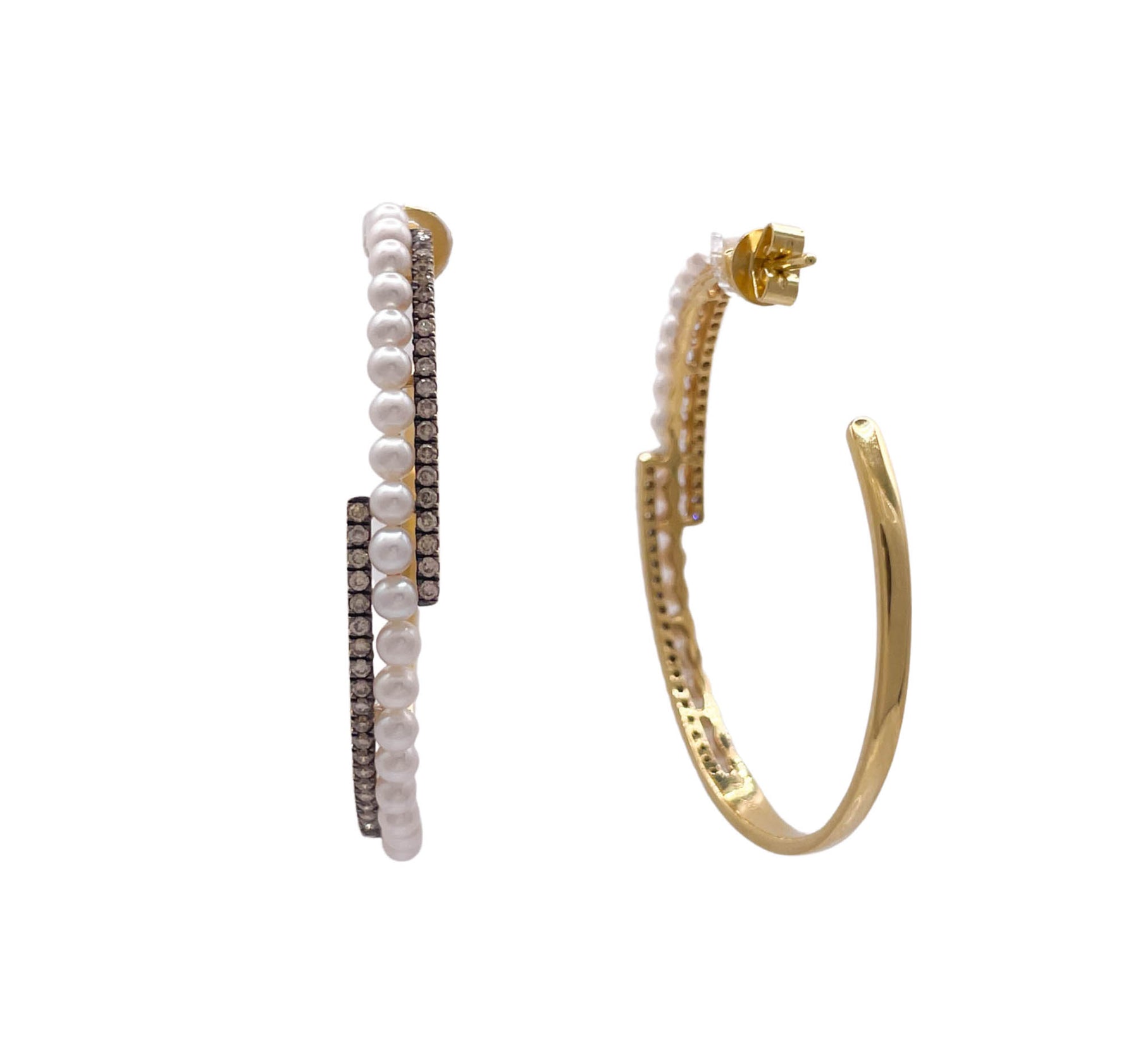 JAY FEDER 18K YELLOW GOLD PEARL AND DIAMOND HOOP EARRINGS